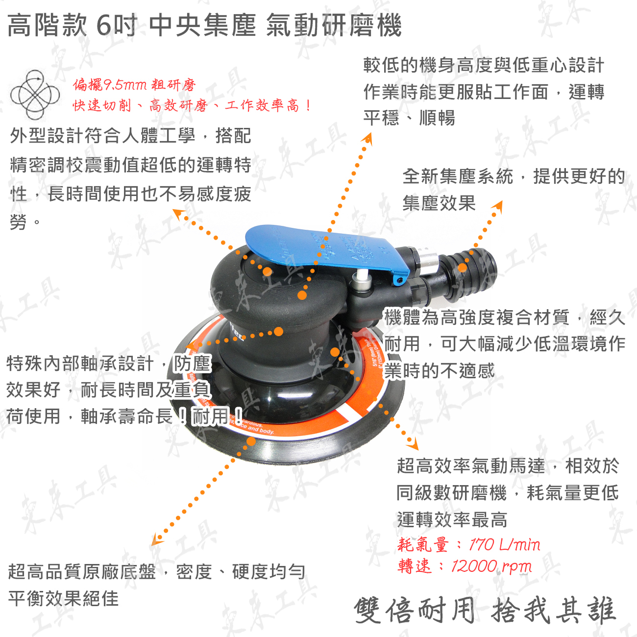 高階款 6吋 快速切削 9.5mm 大偏擺 氣動研磨機 中央集塵